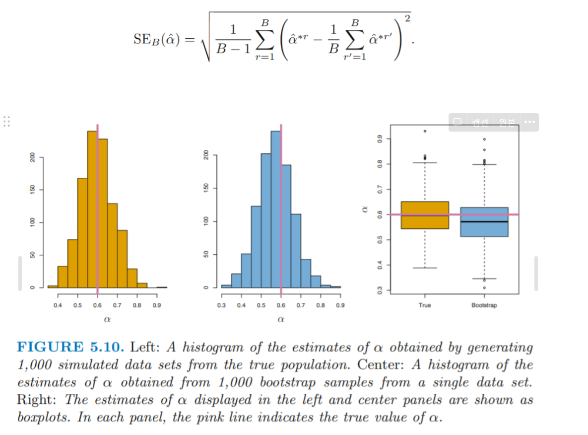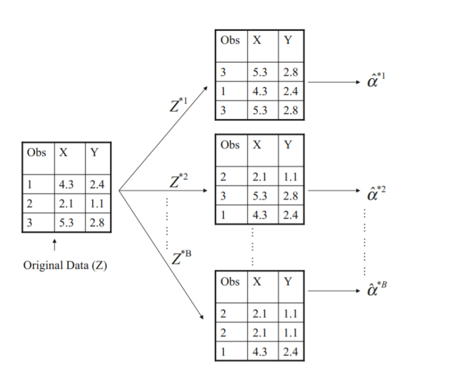 → boostrap을 이용하면 additional samples을 generating 하는 대신 , original data set에서 반복적으로 distinct한 sample을 얻을 수 있고 이를 이용해 추정치를 얻을 수 있다.