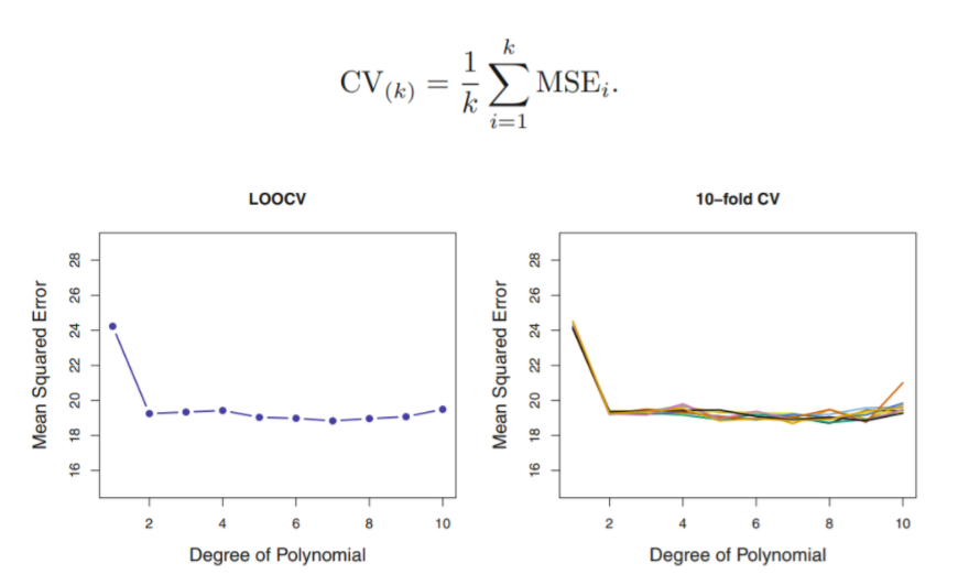 k-fold가 LOOCV보다 lower variance를 가짐 (accurate estimates of the test error)
