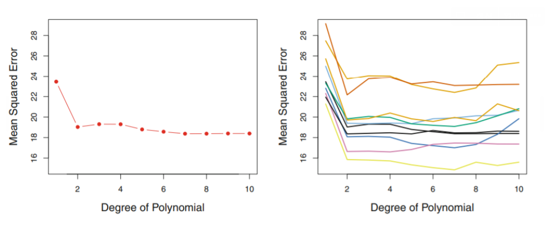 → 이런 과정을 각 fold마다 k번 반복하여 k개의 MSE를 얻은 뒤, 평균을 구하여 test error estimate