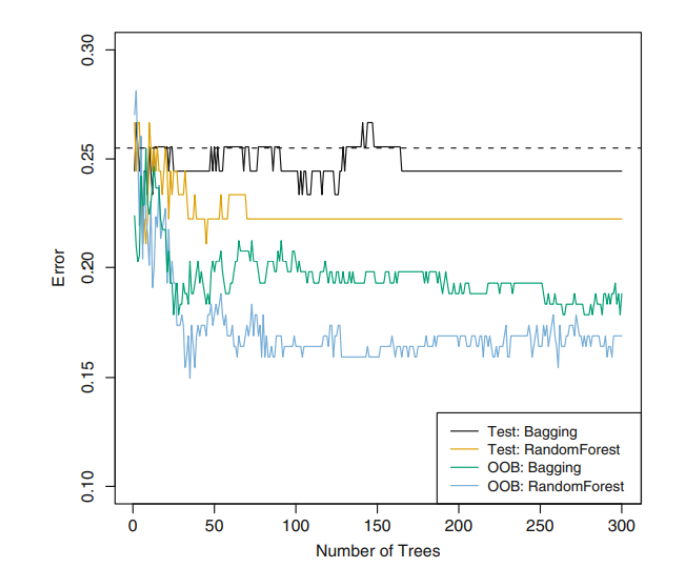 총 n개의 obervaion에 대해서 위와 같은 방법으로 prediction하면, overall OOB MSE / classification error를 얻을 수 있음