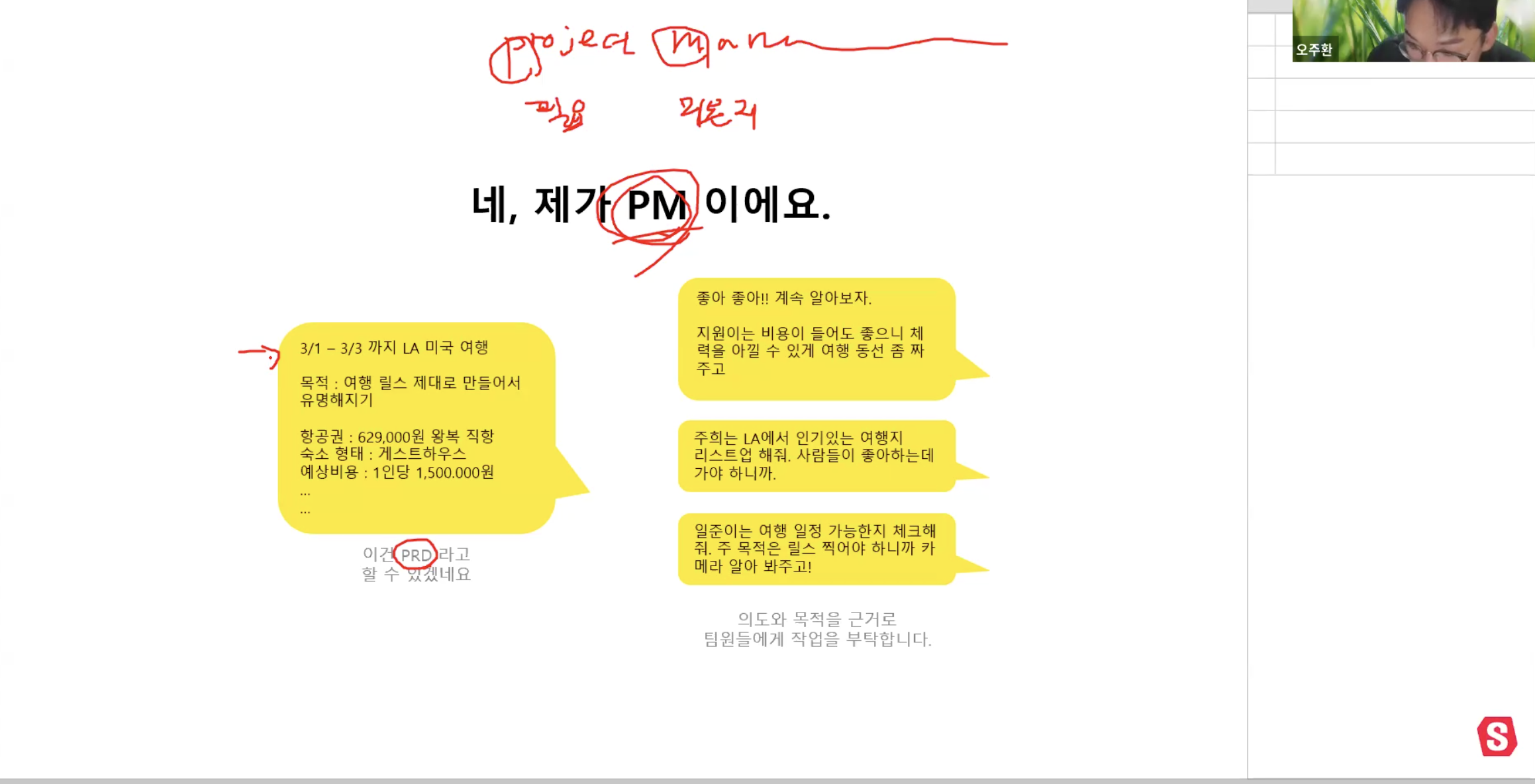 아래는 사전 캠프에서 진행된 오주환 PM님의 라이브세션에서 PM을 "Project Manager" 로, "필요하면 뭐든 다한다"라는 은어로 표현하는 모습이다.