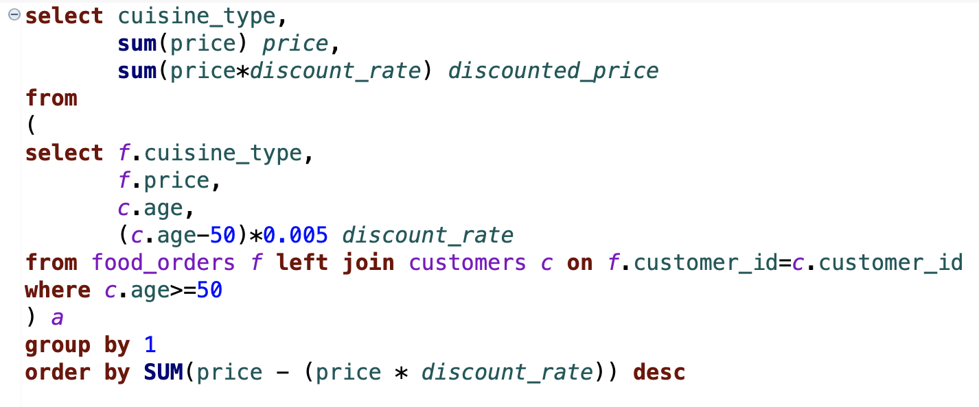 ex)50세 이상 고객의 연령에 따라 경로 할인율을 적용하고, 음식 타입별로 원래 가격과 할인 적용 가격 합을 구하기 (조회 컬럼 : 음식 타입, 원래 가격, 할인 적용 가격)