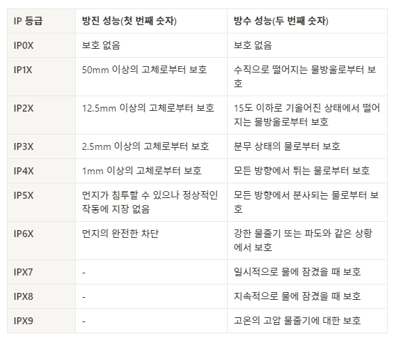 다음은 방진 및 방수 등급의 각 숫자가 의미하는 바를 표로 정리한 것입니다.
