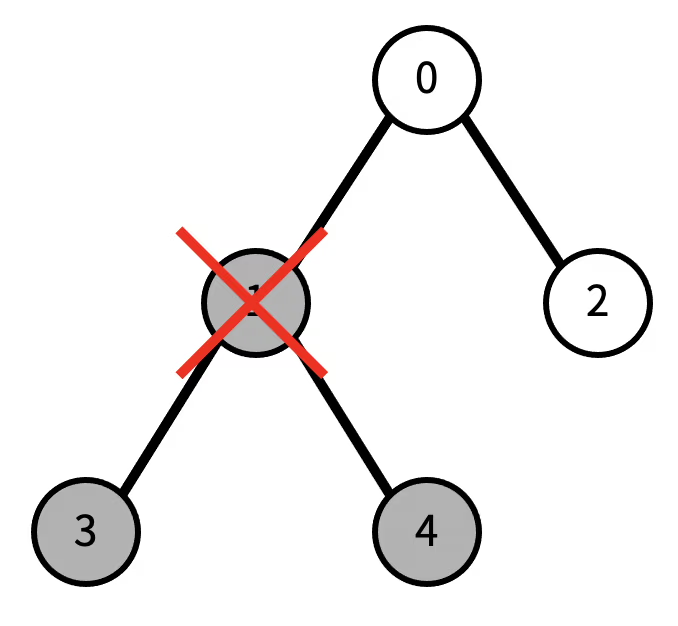 문제의 조건과 같이 노드 하나를 제거해 그 노드와 모든 자손이 트리에서 제거되는 것을 그래프 탐색으로 생각해보자