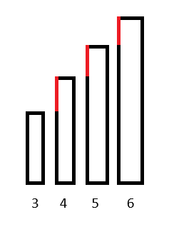 그림과 같이 한 조에 키가 3, 4, 5, 6인 원생들이 키 순서대로 있다고 생각해보면 이때의 비용은 63=36 - 3 = 3이 된다. 이는 다시 생각해보면 그림에서 빨간색으로 칠한 부분처럼 키 순서대로 정렬했을 때 인접한 원생들의 키 차이를 모두 더한값이 된다는 것을 알 수 있다.