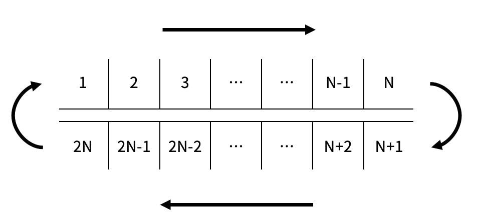 현재 올리는 위치를 idx라고 잡으면 내리는 위치는 idx + N - 1 가 됨