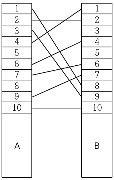 예시 상황에 따라 A의 위치를 기준으로 정렬한 B의 위치는 [8, 2, 9, 1, 4, 6, 7, 10] 이고