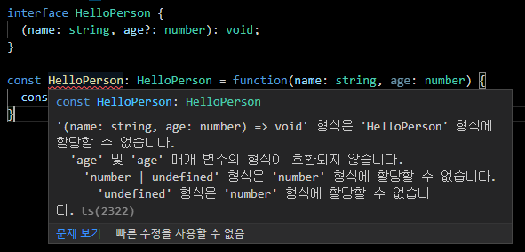 같은 이름으로 2개를 불러 오려면 age에 ?를 붙인다 대신 age에 undefiend가 올지 number가 올지 모르기때문에 if문을 넣어준다.