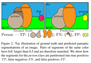 Panoptic Quality(PQ): Panoptic segmentation 논문에서 제시한 평가 지표이며, 아래 그림과 같이 TP, FN, FP를 정의하고 다음의 식과 같이 계산.