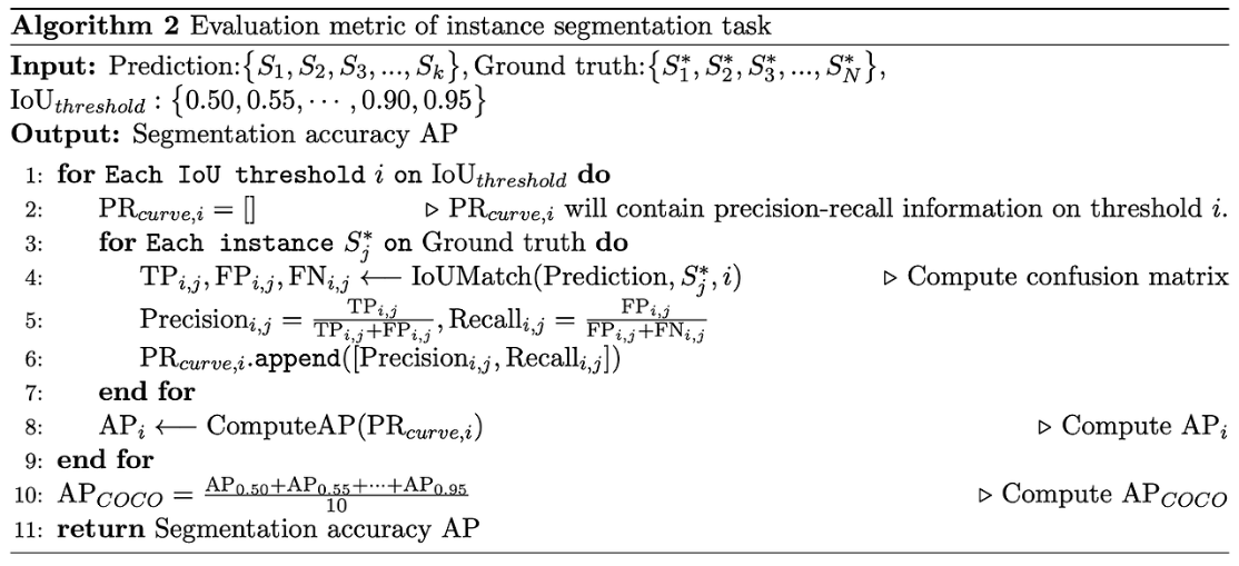 mAP: object detection에서와 같이 구할 수 있으며, bounding box 대신 각 객체별 pixel mask를 사용함. Instance segmentation는 object detection과 같이 각 사물 별 영역을 구할 수 있기 때문에 mAP가 주로 사용됨.