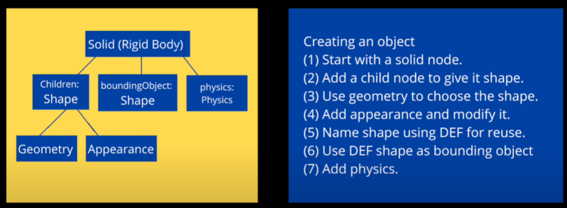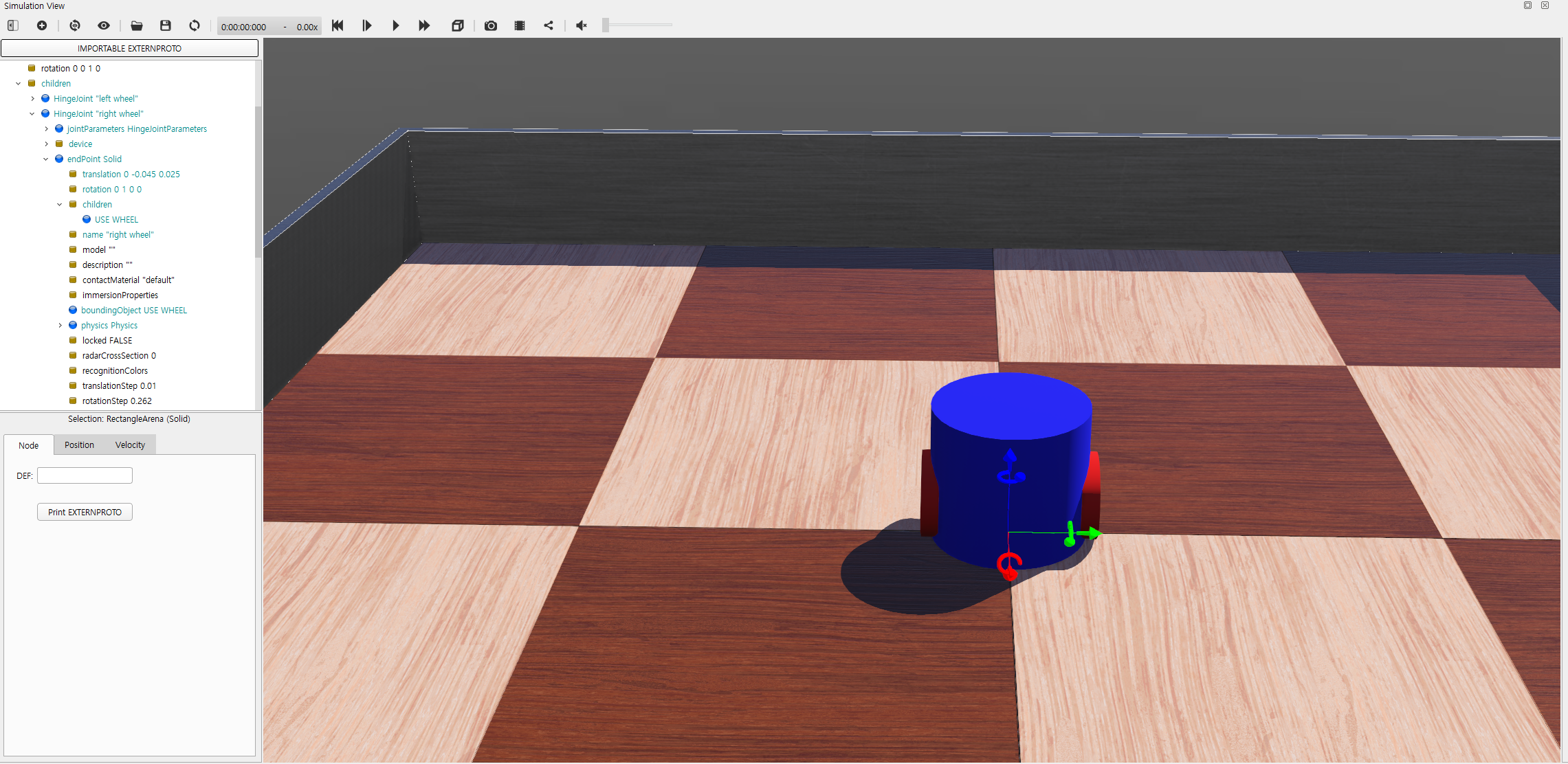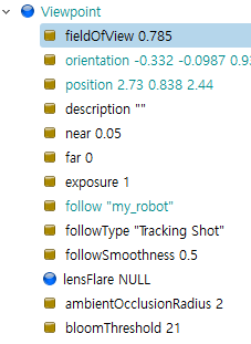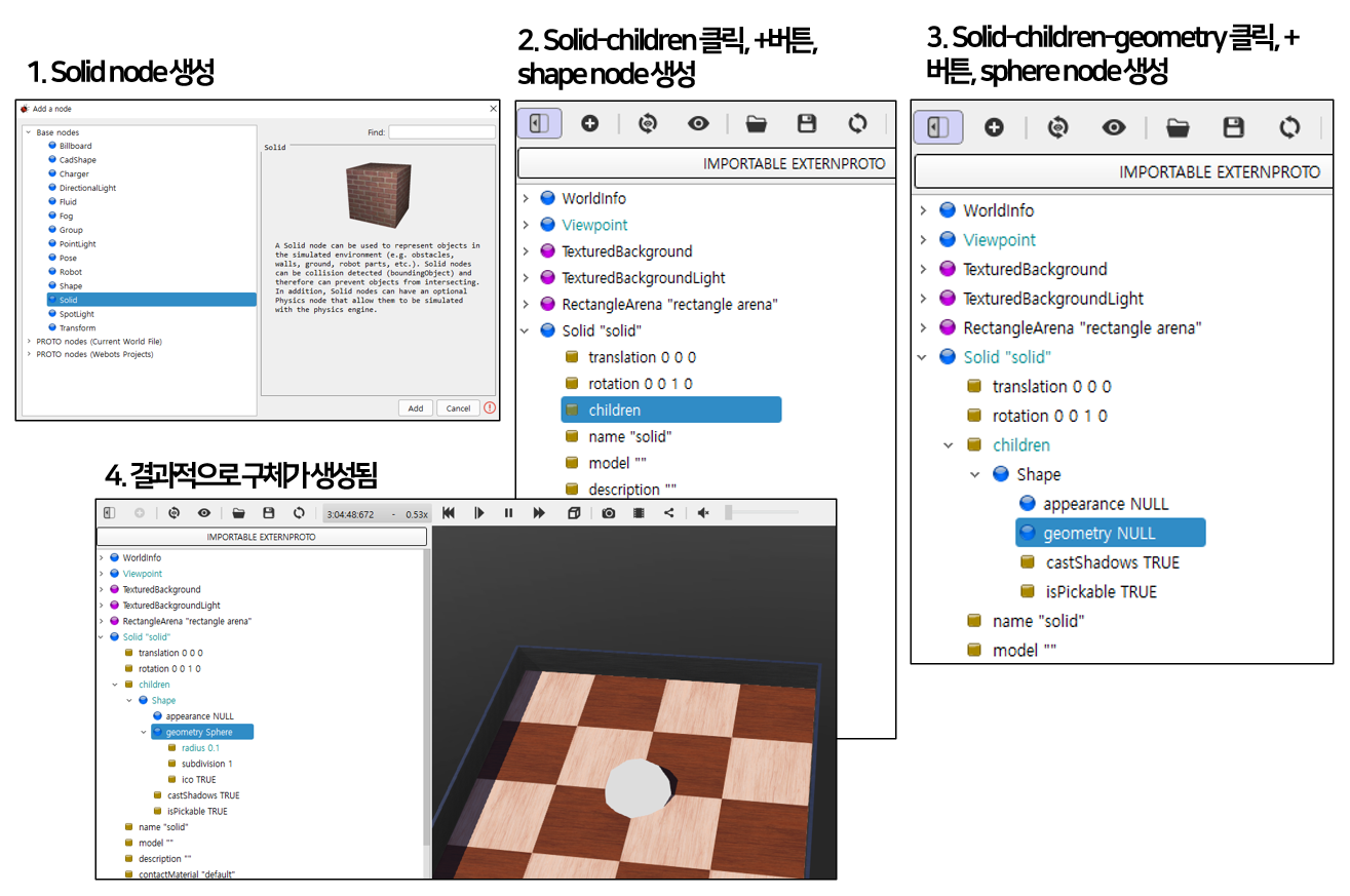 Webots에서는 각 객체를 노드(node)라고 부름: 객체 뿐만 아니라, 회전 시스템, 조명 등도 노드로 이루어져 있음