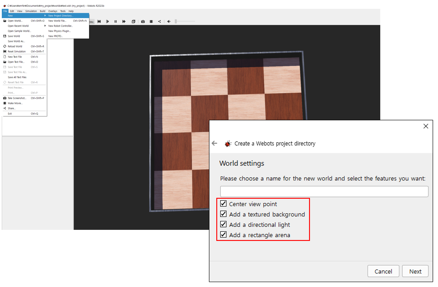 계속 Next 선택 및, "world settings" 단계에서 프로젝트 이름과 체크박스 확인