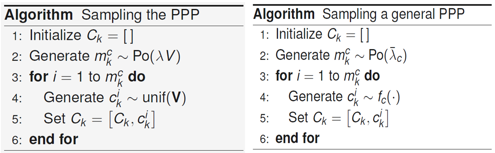 이때 Ck 특성은 다음과 같다. Clutter의 갯수는 mkc∼Po(λV)와 같이 푸아송 분포를 따르고, Ck에 들어있는 관측값들 ck1,⋯,ckmkc들은 i.i.d.이고 cki∼unif(V)이다.