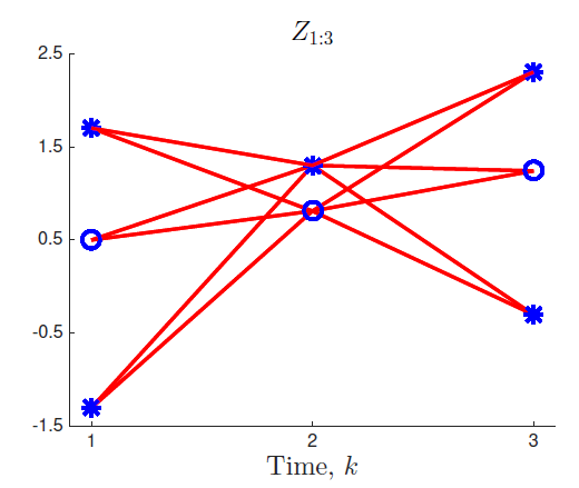 이제 이러한 clutter 모델을 사용하여 p(Zk∣xk)를 찾고 clutter가 있는 환경에서의 update 과정을 수행할 수 있다. 이때 문제가 되는 점은 Zk의 길이가 무작위하고, 어느 값이 관심 객체에 의한 검출값인지 모른다는 것이다. 이를 해결하기 위하여 data association 과정이 추가되며, 이는 다음과 같이 표현되어 어떤 측정값이 관심 객체에 대한 것인지 표시한다.