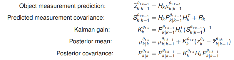 여기서 각 모델들이 linear Gassian이라면 Kalman filter를 사용하여 다음과 같이 실제 계산을 수행할 수 있다. pk∣k−1θ1:k−1(xk−1)=N(xk;μk∣k−1θ1:k−1,Pk∣k−1θ1:k−1), gk(ok∣xk)=N(ok;Hkxk,Rk)로 주어진다면 다음과 같다(이때, 일반적인 관측치 z에 대한 measurement model이 아닌 관심 객체 검출에 대한 식 gk(ok∣xk)가 주어지는 이유는 각 data association hypothesis가 주어지고 해당 hypothesis 객체라고 생각한 후 계산하여 모든 경우를 합하기 때문이다).