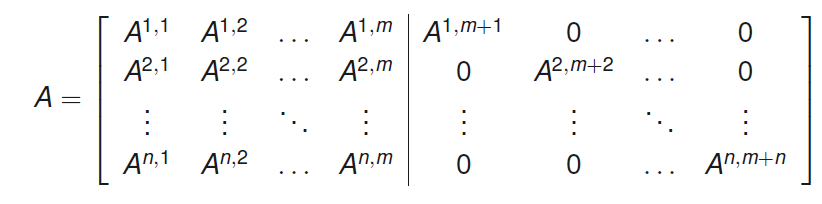 Data association 문제의 assignment matrix는 n × ( m + n ) n \times (m+n) n × ( m + n ) matrix로 표현할 수 있으며, 이는 환경에 존재하는 n개의 객체와 측정값이 포함하는 m개의 검출결과 및 n개의 미검출값 간의 할당을 표현한다. 예를 들어 θ i = j \theta^i = j θ i = j 와 같이 i번째 객체가 j번째 측정값에 연관되어 있다면 A i , j = 1 A^{i,j}=1 A i , j = 1 과 같이 표현하고, θ i = 0 \theta^i = 0 θ i = 0 와 같이 i번째 객체가 미검출되었다면, A i , m + i = 1 A^{i,m+i}=1 A i , m + i = 1 와 같이 표현한다(다른 element는 0). 전체적인 형태는 다음 그림과 같으며, 검출결과에 따른 n × m n \times m n × m sub matrix와 미검출에 따른 n × n n \times n n × n 대각 행렬로 이루어져 있다.