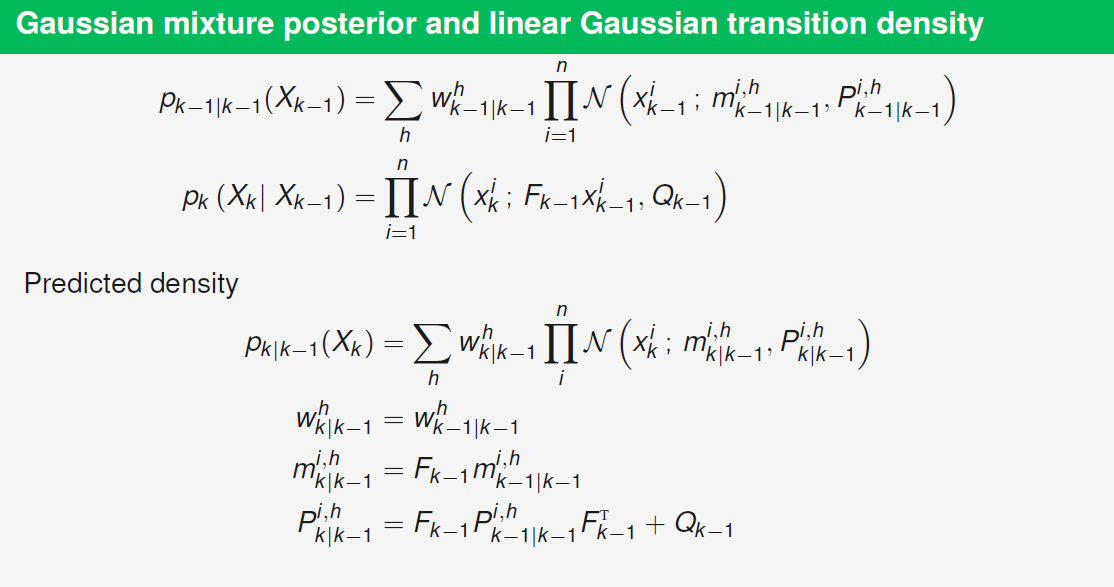 p k ∣ k − 1 ( X k ) = ∫ p k ( X k ∣ X k − 1 ) p k − 1 ∣ k − 1 ( X k − 1 ) d X k − 1 = ∫ p k ( X k ∣ X k − 1 ) [ ∑ h w k − 1 ∣ k − 1 h p k − 1 ∣ k − 1 ( X k − 1 ) ] d X = ∑ h w k − 1 ∣ k − 1 h ∫ p k ( X k ∣ X k − 1 ) p k − 1 ∣ k − 1 ( X k − 1 ) d X = ∑ h w k − 1 ∣ k − 1 h p k ∣ k − 1 h ( X k ) \begin{aligned} p_{k|k-1} (X_k) & = \int p_k(X_k|X_{k-1}) p_{k-1|k-1}(X_{k-1}) d X_{k-1} \\ & = \int p_k(X_k|X_{k-1}) \left[ \sum_{h} w^h_{k-1|k-1} p_{k-1|k-1}(X_{k-1}) \right] dX \\ & = \sum_{h} w^h_{k-1|k-1} \int p_k(X_k|X_{k-1}) p_{k-1|k-1}(X_{k-1}) dX = \sum_{h} w^h_{k-1|k-1} p^h_{k|k-1} (X_k) \end{aligned} p k ∣ k − 1 ( X k ) = ∫ p k ( X k ∣ X k − 1 ) p k − 1 ∣ k − 1 ( X k − 1 ) d X k − 1 = ∫ p k ( X k ∣ X k − 1 ) [ h ∑ w k − 1 ∣ k − 1 h p k − 1 ∣ k − 1 ( X k − 1 ) ] d X = h ∑ w k − 1 ∣ k − 1 h ∫ p k ( X k ∣ X k − 1 ) p k − 1 ∣ k − 1 ( X k − 1 ) d X = h ∑ w k − 1 ∣ k − 1 h p k ∣ k − 1 h ( X k )