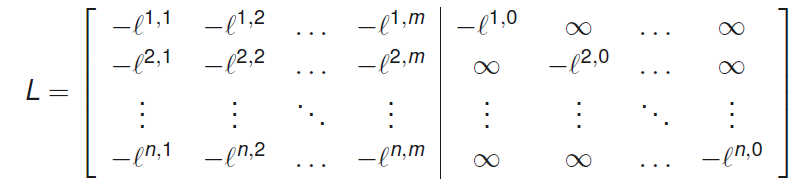 이제 적당한 형태의 cost matrix L L L 을 정의하면 다음과 같이 최적화 문제의 형태로 적을 수 있으며, 그 L L L 의 형태는 다음 그림과 같은 예시를 들 수 있다. Assignment matrix와 마찬가지로 검출결과에 따른 n × m n \times m n × m sub matrix와 미검출에 따른 n × n n \times n n × n 대각 행렬로 이루어져 있고, t r ( A T L h ) tr(A^TL^h) t r ( A T L h ) 가 negative log를 나타내는 식이므로 w ~ θ ∣ h = e x p ( − t r ( A T L h ) ) \tilde{w}^{\theta | h} = exp(-tr(A^TL^h)) w ~ θ ∣ h = e x p ( − t r ( A T L h ) ) 로 계산할 수 있다(주어진 data association θ \theta θ 에 대한 weigth).