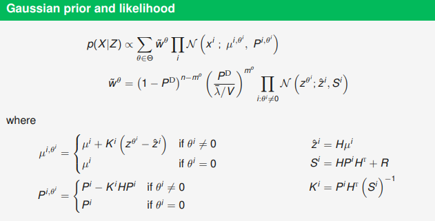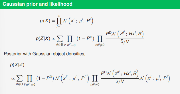 p Z ∣ X ( Z ∣ X ) = ∑ θ ∈ Θ p Z , θ ∣ X ( Z , θ ∣ X ) = ∑ θ ∈ Θ p Z ∣ X , θ , m ( Z ∣ X , θ , m ) p θ , m ∣ X ( θ , m ∣ X ) = ∑ θ ∈ Θ [ ∏ j : ∄ θ i = j f c ( z j ) ∏ i : θ i ≠ 0 g ( z θ i ∣ x i ) m c ! m ! P o ( m c ∣ λ c ˉ ) ∏ i : θ i = 0 ( 1 − P D ( x i ) ) ∏ i : θ i ≠ 0 P D ( x i ) ] = ∑ θ ∈ Θ [ e − λ c ˉ m ! ∏ j : ∄ θ i = j λ c ( z j ) ∏ i : θ i = 0 ( 1 − P D ( x i ) ) ∏ i : θ i ≠ 0 P D ( x i ) g ( z θ i ∣ x i ) ] = ∑ θ ∈ Θ [ e − λ c ˉ m ! ∏ j = 1 m λ c ( z j ) ∏ i : θ i = 0 ( 1 − P D ( x i ) ) ∏ i : θ i ≠ 0 P D ( x i ) g ( z θ i ∣ x i ) λ c ( z θ i ) ] ∝ ∑ θ ∈ Θ [ ∏ i : θ i = 0 ( 1 − P D ( x i ) ) ⏟ m i s s e d d e t e c t i o n s ∏ i : θ i ≠ 0 P D ( x i ) g ( z θ i ∣ x i ) λ c ( z θ i ) ⏟ d e t e c t i o n s ] \begin{aligned} p_{Z|X}(Z|X) & = \sum_{\theta \in \Theta}p_{Z, \theta|X}(Z,\theta|X) = \sum_{\theta \in \Theta}p_{Z|X, \theta, m}(Z|X, \theta, m)p_{\theta, m|X}(\theta, m|X) \\ & = \sum_{\theta \in \Theta}\left[ \prod_{j: \nexists \theta^i=j}{f_c(z^j)}\prod_{i: \theta^i\ne0}{g(z^{\theta^i}|x^i)} \frac{m^c!}{m!}Po(m^c|\bar{\lambda_c})\prod_{i:\theta^i=0}{(1-P^D(x^i))}\prod_{i:\theta^i\ne0}{P^D(x^i)} \right] \\ & = \sum_{\theta \in \Theta} \left[ \frac{e^{-\bar{\lambda_c}}}{m!} \prod_{j: \nexists \theta^i=j} \lambda_c(z^j) \prod_{i:\theta^i=0}{(1-P^D(x^i))} \prod_{i: \theta^i\ne0}{P^D(x^i)g(z^{\theta^i}|x^i)} \right] \\ & = \sum_{\theta \in \Theta} \left[ \frac{e^{-\bar{\lambda_c}}}{m!} \prod_{j=1}^m \lambda_c(z^j) \prod_{i:\theta^i=0}{(1-P^D(x^i))} \prod_{i: \theta^i\ne0}{\frac{P^D(x^i)g(z^{\theta^i}|x^i)}{\lambda_c(z^{\theta^i})}} \right] \\ & \propto \sum_{\theta \in \Theta} \left[ \underbrace{\prod_{i:\theta^i=0}{(1-P^D(x^i))}}_{missed\;detections} \underbrace{\prod_{i: \theta^i\ne0}{\frac{P^D(x^i)g(z^{\theta^i}|x^i)}{\lambda_c(z^{\theta^i})}}}_{detections} \right] \end{aligned} p Z ∣ X ( Z ∣ X ) = θ ∈ Θ ∑ p Z , θ ∣ X ( Z , θ ∣ X ) = θ ∈ Θ ∑ p Z ∣ X , θ , m ( Z ∣ X , θ , m ) p θ , m ∣ X ( θ , m ∣ X ) = θ ∈ Θ ∑ ⎣ ⎢ ⎡ j : ∄ θ i = j ∏ f c ( z j ) i : θ i = 0 ∏ g ( z θ i ∣ x i ) m ! m c ! P o ( m c ∣ λ c ˉ ) i : θ i = 0 ∏ ( 1 − P D ( x i ) ) i : θ i = 0 ∏ P D ( x i ) ⎦ ⎥ ⎤ = θ ∈ Θ ∑ ⎣ ⎢ ⎡ m ! e − λ c ˉ j : ∄ θ i = j ∏ λ c ( z j ) i : θ i = 0 ∏ ( 1 − P D ( x i ) ) i : θ i = 0 ∏ P D ( x i ) g ( z θ i ∣ x i ) ⎦ ⎥ ⎤ = θ ∈ Θ ∑ ⎣ ⎢ ⎡ m ! e − λ c ˉ j = 1 ∏ m λ c ( z j ) i : θ i = 0 ∏ ( 1 − P D ( x i ) ) i : θ i = 0 ∏ λ c ( z θ i ) P D ( x i ) g ( z θ i ∣ x i ) ⎦ ⎥ ⎤ ∝ θ ∈ Θ ∑ ⎣ ⎢ ⎢ ⎢ ⎢ ⎢ ⎡ m i s s e d d e t e c t i o n s i : θ i = 0 ∏ ( 1 − P D ( x i ) ) d e t e c t i o n s i : θ i = 0 ∏ λ c ( z θ i ) P D ( x i ) g ( z θ i ∣ x i ) ⎦ ⎥ ⎥ ⎥ ⎥ ⎥ ⎤