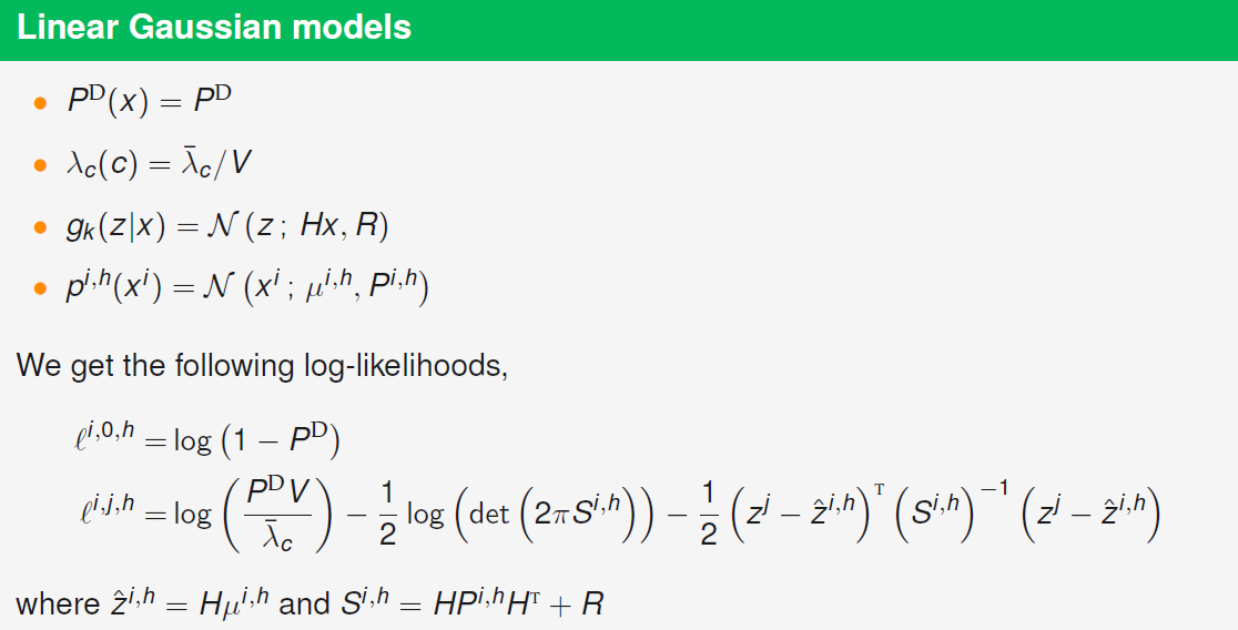객체를 측정값 z z z 에 연관시키는 것이기 때문에, θ k i ∈ { 0 , ⋯ , m k } \theta^i_k \in \{0, \cdots, m_k \} θ k i ∈ { 0 , ⋯ , m k } 이며(m k m_k m k 는 측정값의 개수), 서로 다른 객체에 대한 association 값은 0일 때를 제외하고 같은 값을 갖지 않는다(즉, 두 객체가 동일한 측정값과 연관되지 않는다, the point object assumption). 또한 m k c = m k − m k o m_k^c = m_k - m_k^o m k c = m k − m k o 이다.