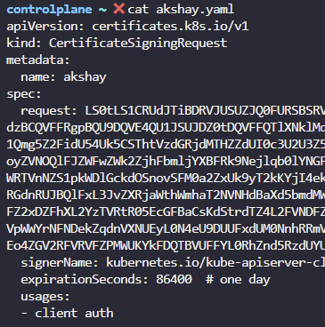 cat akshay.csr | base64 -w 0 //CSR 의 request에는 base64 로 인코딩된 csr 파일 내용이 들어가야 함