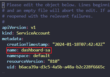 kubectl edit serviceaccounts dashboard-sa