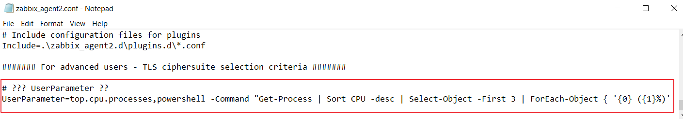 UserParameter=top.cpu.processes,powershell -command "Get-Process | Sort CPU -Descending | Select -First 3 | ForEach { '$($_.ProcessName) ($($_.CPU)%)' }"