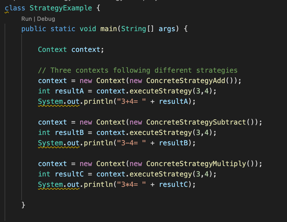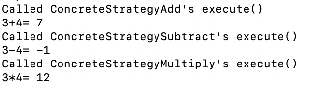 context class와 main class이다. client가 원하는 strategy를 context에 넣어준다. 그 후, context는 strategy의 method를 실행시켜준다. 그러면 각 strategy마다 다른 결과를 얻을 수 있는 것을 볼 수 있다.