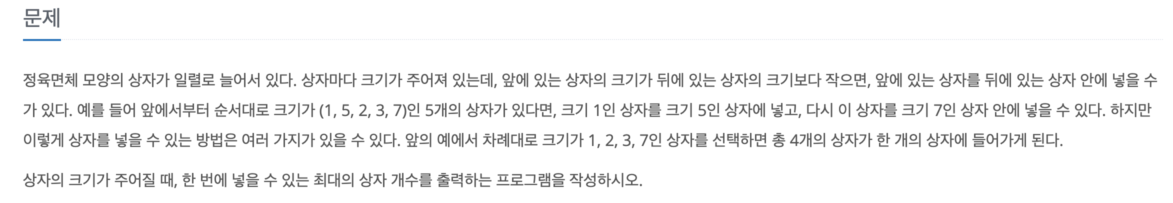 dp문제이다. 그리고 단순히 LIS(최장 증가 수열)을 적용하면 되는 문제이다.