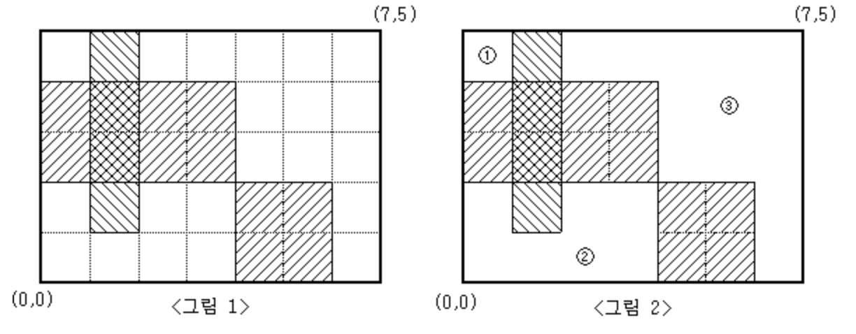 예를 들어 M=5, N=7 인 모눈종이 위에 <그림 1>과 같이 직사각형 3개를 그렸다면, 그 나머지 영역은 <그림 2>와 같이 3개의 분리된 영역으로 나누어지게 된다.