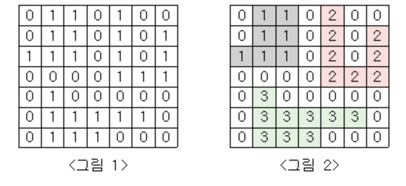 <그림 1>과 같이 정사각형 모양의 지도가 있다. 1은 집이 있는 곳을, 0은 집이 없는 곳을 나타낸다. 철수는 이 지도를 가지고 연결된 집의 모임인 단지를 정의하고, 단지에 번호를 붙이려 한다. 여기서 연결되었다는 것은 어떤 집이 좌우, 혹은 아래위로 다른 집이 있는 경우를 말한다. 대각선상에 집이 있는 경우는 연결된 것이 아니다. <그림 2>는 <그림 1>을 단지별로 번호를 붙인 것이다. 지도를 입력하여 단지수를 출력하고, 각 단지에 속하는 집의 수를 오름차순으로 정렬하여 출력하는 프로그램을 작성하시오.