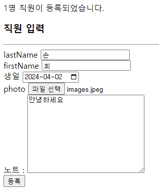 mapper.insertEmployee(employee); ์ผ๋ก ์ธํด ์ง์ ๋ฑ๋ก ์ฌ๋ถ์ ๋ฐ๋ฅธ ๋ฉ์์ง๋ฅผ ํ์ํฉ๋๋ค.sub5.jsp(view)