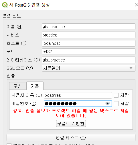 데이터 베이스 정보를 입력하고 연결을 선택하면 QGIS에 POSTGIS의 데이터 레이어를 볼 수 있다.