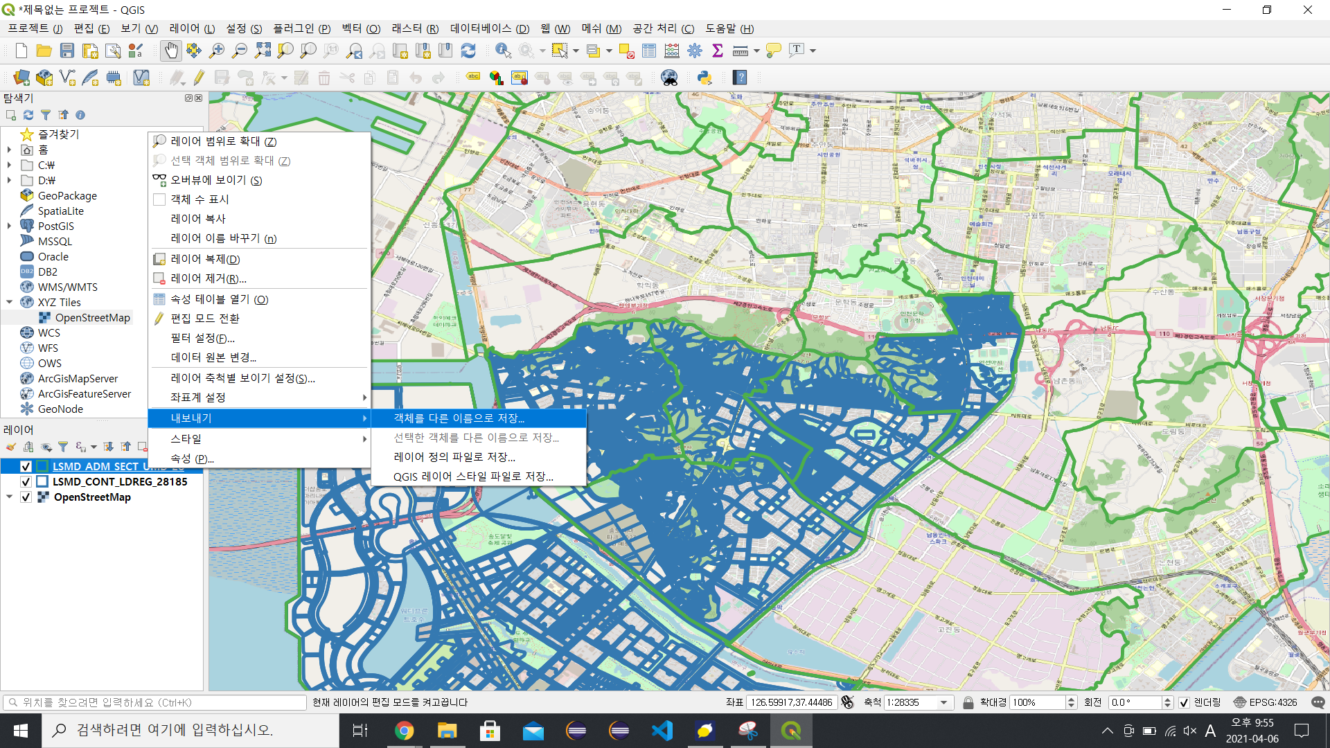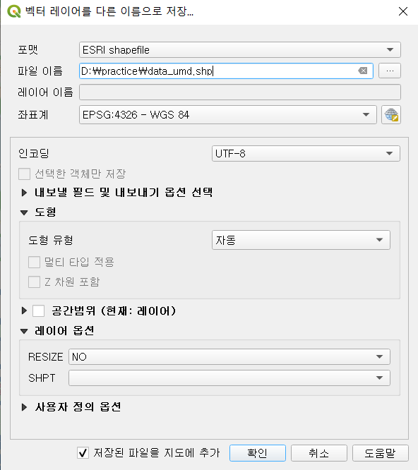 내가 설정한 좌표계(현재는 4326)을 설정해서 저장한다