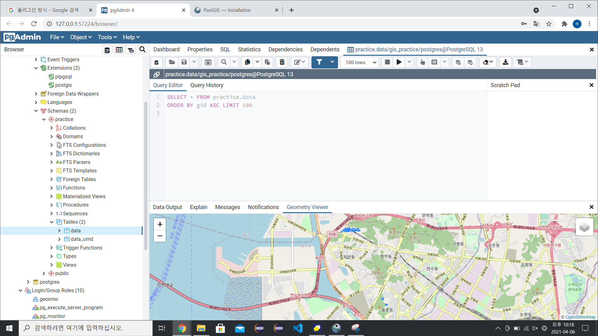 pgadmin에서 사용자가 선택한 스키마에 테이블이 생성된 것과 데이터를 보면 정상적으로 import된 것을 확인할 수 있다.
