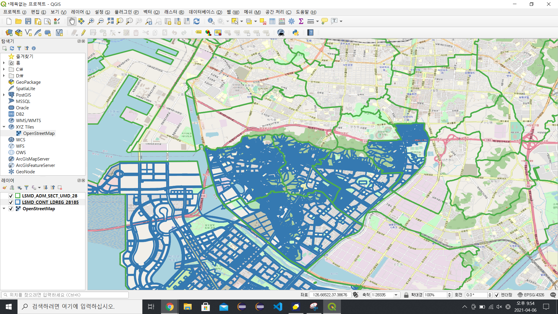 QGIS에서 open street map을 추가(실제 지도를 보기위해)하고, 위에서 다운받은 연속지적도, 행정구역_읍면동을 추가한다