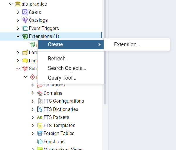 생성한 데이터베이스에서 Extensions 우클릭 > create > Extension
