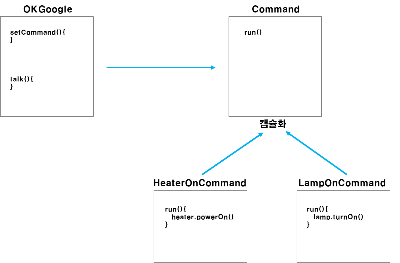 OKGoogle이 할 수 있는 기능들(Heater를 튼다, Lamp를 킨다.)을 클래스로 만들어서(HeaterOnCommand, LampOnCommand) 각 기능들을 캡슐화 합니다.
