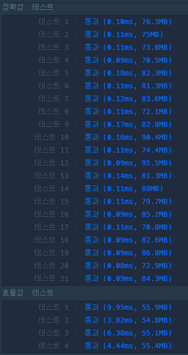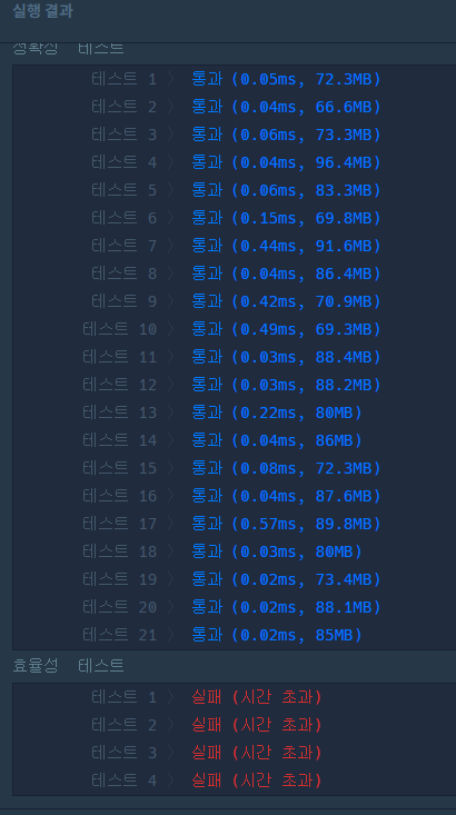 - 실제로 두 풀이다 TEST CASE의 정확성 테스트는 통과했다. 하지만 DFS는 모든 경우를 다 탐색하는 방식으로 효율성 테스트에서 떨어졌다.(어떤 깊이가 가장 짧은지 전체를 탐색한 후에 결정가능)