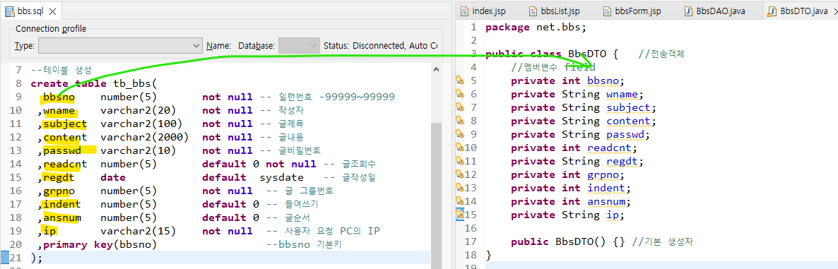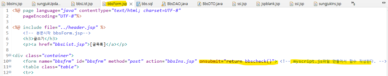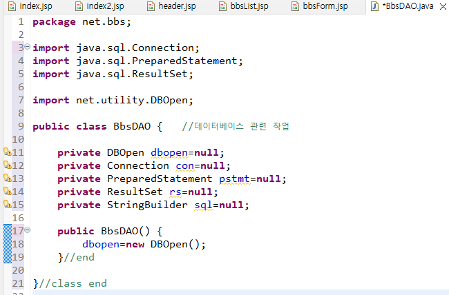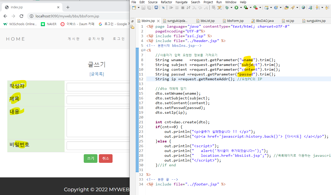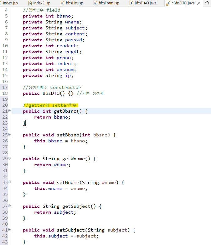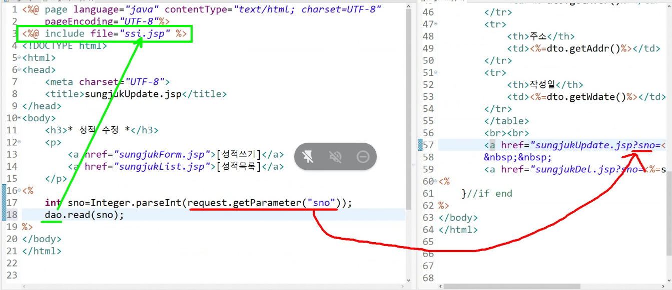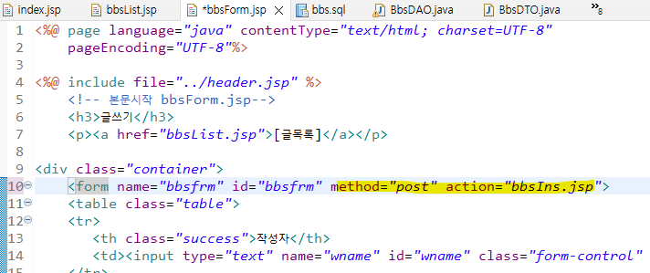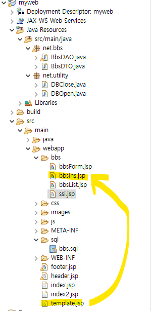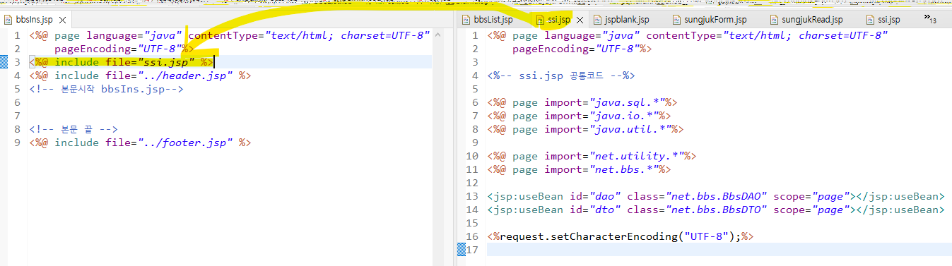 dao,dto(bean이라는 형태의 객체)는 ssi.jsp 파일 안에 include되어있음 = 페이지를 나누기 시작하면서 여러 .jsp를 왔다 갔다 해야하므로 헷갈리지 말자