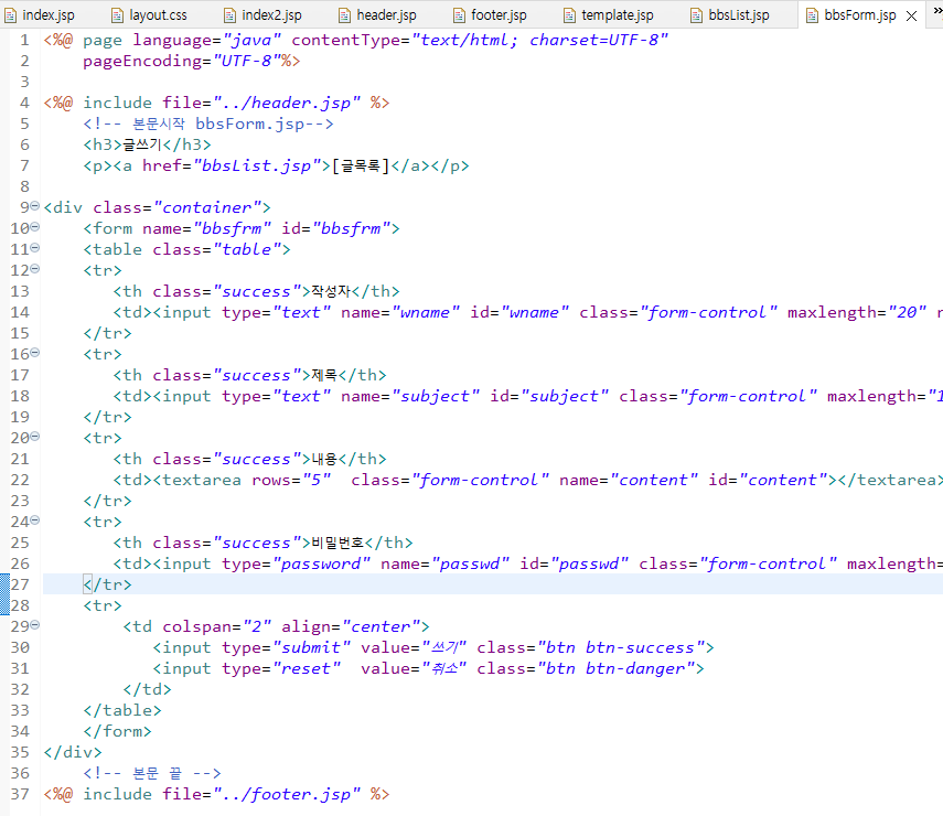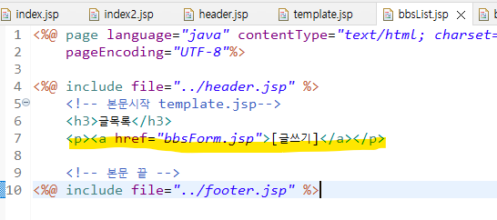➡️ 공통으로 들어가는 부분은 이런식으로 항상 jsp파일로 따로 빼서 템플릿을 만드는 것이 유지보수에도 좋고 코드를 짤때도 굉장히 편리하다.