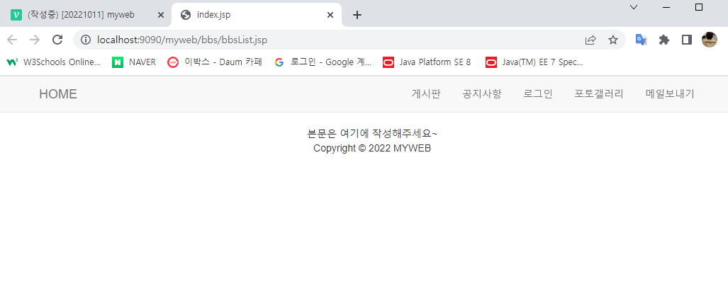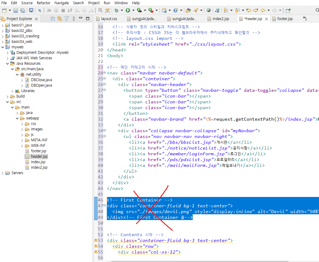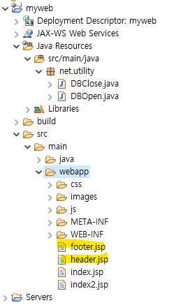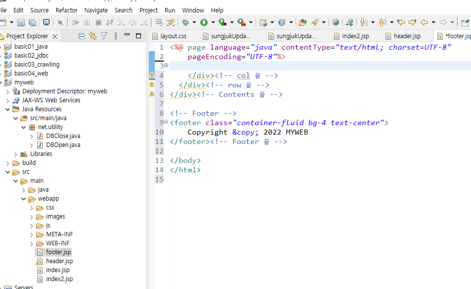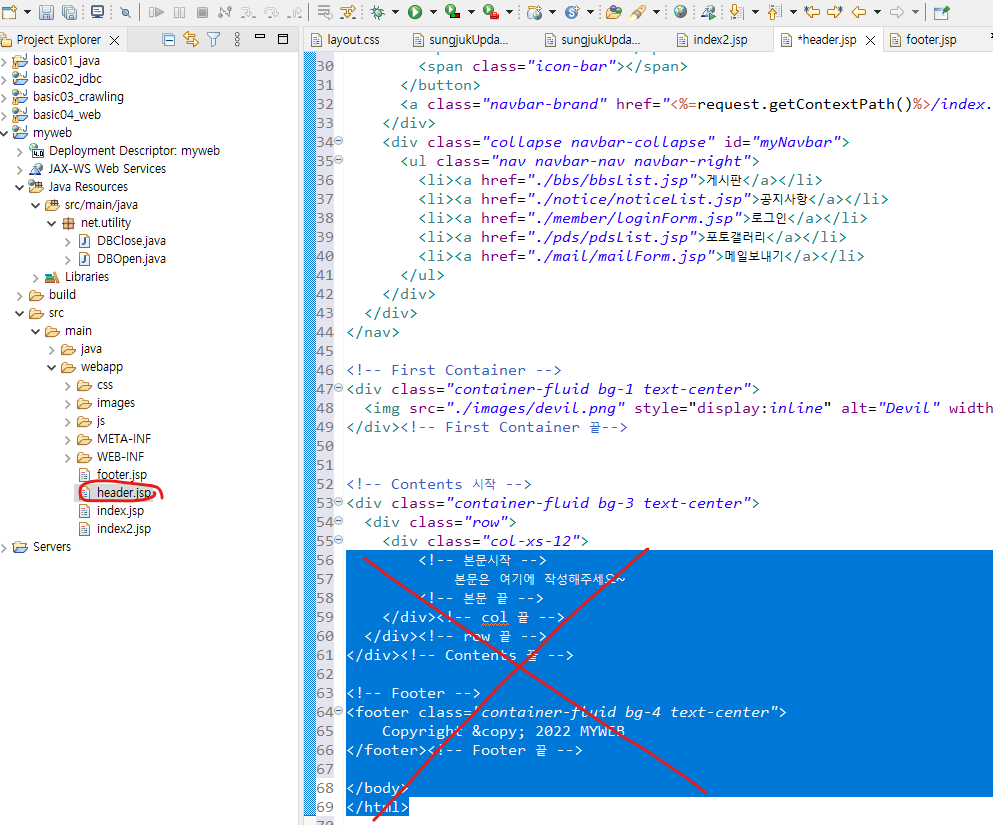 ↳ header.jsp footer.jsp에 있는 내용이 그대로 들어가있다.