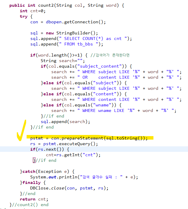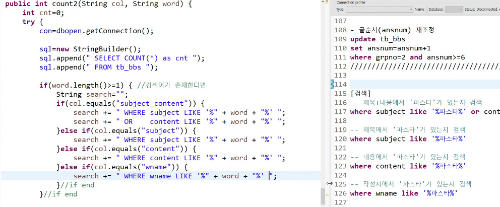 → 바로 밑에 작성해서 sql에 넣어줘야하는데 sql문이 이미 들어가있어서 sql값을 지우고 sql = new StringBuilder();을 재활용한다.