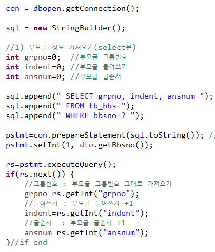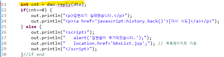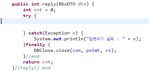 (2) BbsDAO.java에서 int cnt = dao.reply(dto); 함수 작성하기