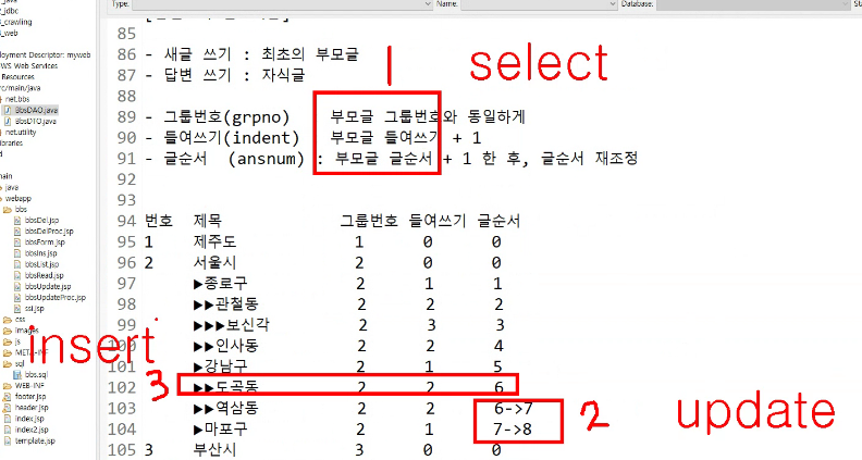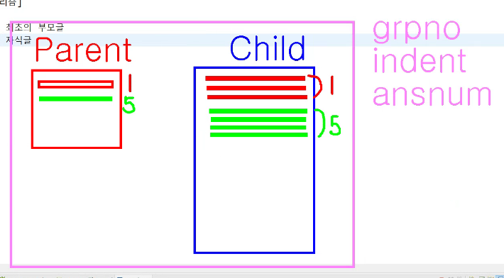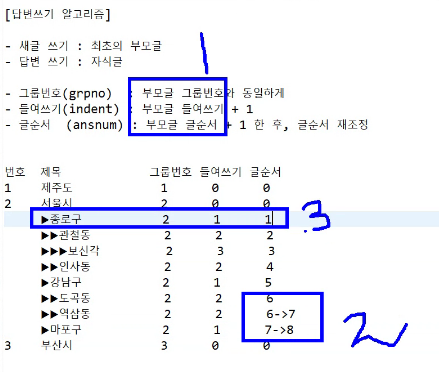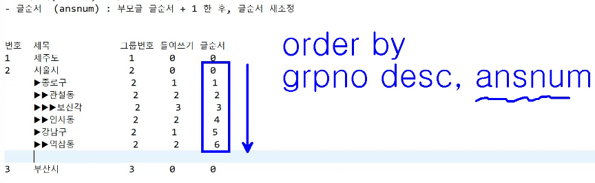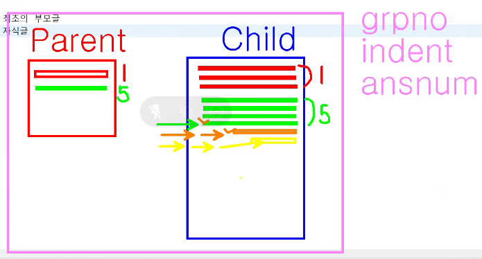 - grpno 그룹번호, indent 들여쓰기, ansnum 글순서