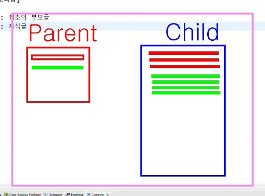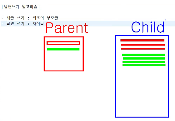 - 부모와 자식 테이블이 나오는데, 부모 테이블에 있는 글 한개 안에 여러개의 글이 또 들어갈 수 있다. (부모의 빨간색 글과 자식테이블의 빨간색 글 3개)