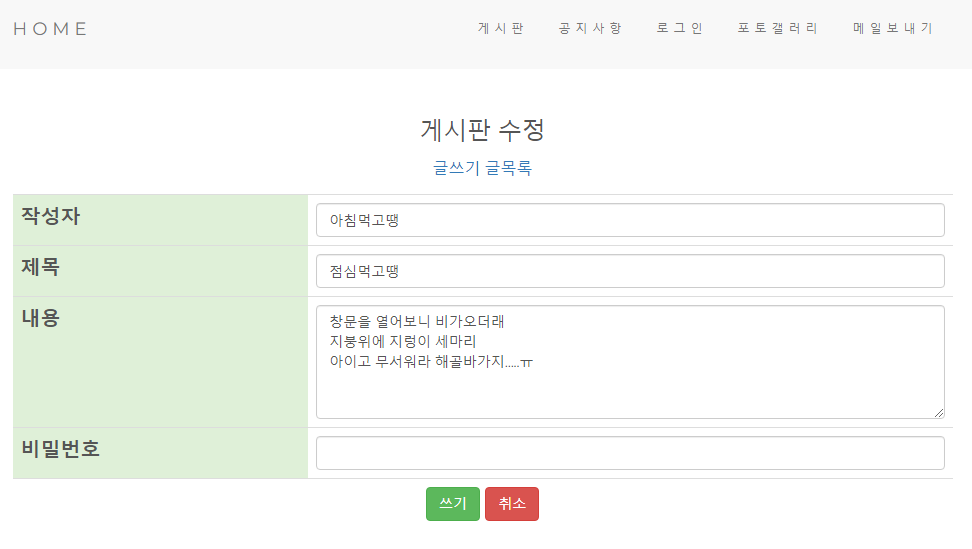 글번호와 비밀번호가 일치하면 행 수정해주는 페이지