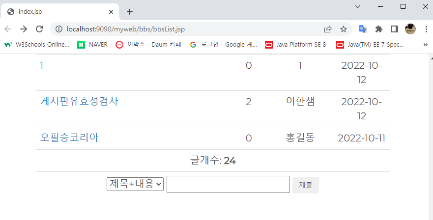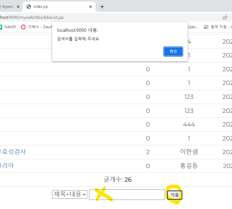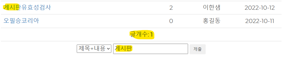 → 아직 게시판에 검색한 게시물만 나오도록 하는 기능은 구현하지 않았음. 글 개수만 확인하기