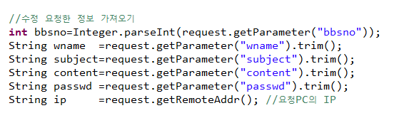 - bbsUpdate.jsp의 값을들 request로 가져와서 변수에 담는다.