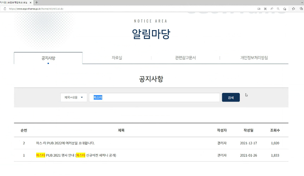 → 공지사항 페이지에서 검색어를 입력하면 똑같은 페이지 내에서 파스타 단어가 포함되어 있는 것만 나오기 때문이다. 게시글만 바뀌고 페이지는 변하지않는다.
